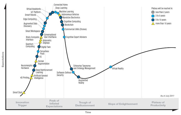 هناك الكثير من الأسباب للاعتقاد بأن هذه الموجة الأخيرة من الاهتمام بالذكاء الإصطناعي ستكون أكثر دواماً. ووفقاً ل "غارتنر ريزارتش"، فإن التقنيات تنتقل عادة من "ذروة توقعات متضخمة" عبر "الإنهيار نحو القاع " حتى تصل أخيرا إلى "مرحلة من الإنتاجية المستقرة". التقنيات المكثفة كالمساعدين الإفتراضيين virtual assistants, وإنترنت الأشياء والروبوتات الذكية واكتشاف البيانات المعززة augmented هي على وشك الوصول إلى القمة. ومن المتوقع أن يصل التعلم العميق والتعلم الآلي ومستشارو الخبراء المعرفيون cognitive expert advisors إلى مستوى مستقر من التطبيقات السائدة في سنتين إلى خمس سنوات.