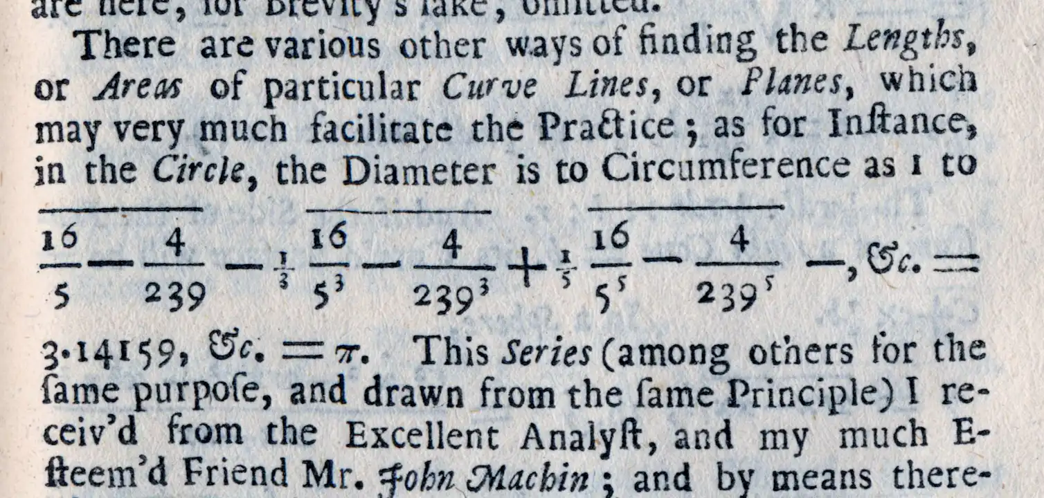في صفحات ال Synopsis التي كتبها بيّن جونز معرفته بمفهوم السلسلة التي لا نهاية لها، وكيف يمكن أن تساعد في حساب pi (٨) بأكثر دقة مما كان ممكنا عن طريق رسم وقياس الدوائر. السلسلة التي لا نهاية لها هي مجموع كل الأرقام في التسلسل الذي لا ينتهي ، على سبيل المثال ½ + ¼ + ⅛ + وهلم جرا. إضافة تسلسل لانهائي من ارقام متناهية في الصغر كهذه تنتهي بك أقرب فأقرب إلى عدد لا حصر له من أرقام بعد الفاصلة العشرية - تماماً ك pi . لذلك من خلال تحديد التسلسل الصحيح، تمكن علماء الرياضيات من حساب pi إلى عدد متزايد من المنازل العشرية .