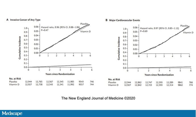 هل ينقذ فيتامين د الأرواح بشكل عام؟ ليس صحيحا. تجربة مبادرة صحة المرأة (13) وضعت بشكل عشوائي 36 ألف امرأة بعد سن اليأس علي فيتامين د مقابل وضعهن على دواء وهمي، ولكن الدراسة لم تجد أي فائدة بشأن البقاء على قيد الحياة.